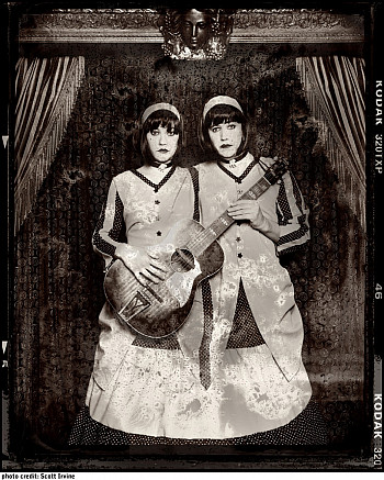 One of Amanda's 2010 projects was Evelyn Evelyn - the world's only conjoined-twin singer-songwriter duo. From their press release:Lyn and Eva Neville were born in September of 1985 on a small farm in Western Kansas. The girls are Parapagus Tripus Dibrachius twins, conjoined at the side and sharing between them three legs, two arms, two hearts, three lungs, and a single liver. Orphaned when their mother died in labor, little is known about their early life until 1996 when they made their first public appearance with Dillard and Fullerton's Traveling Circus. It was here that the "Evelyn" sisters developed their love of song and performance.