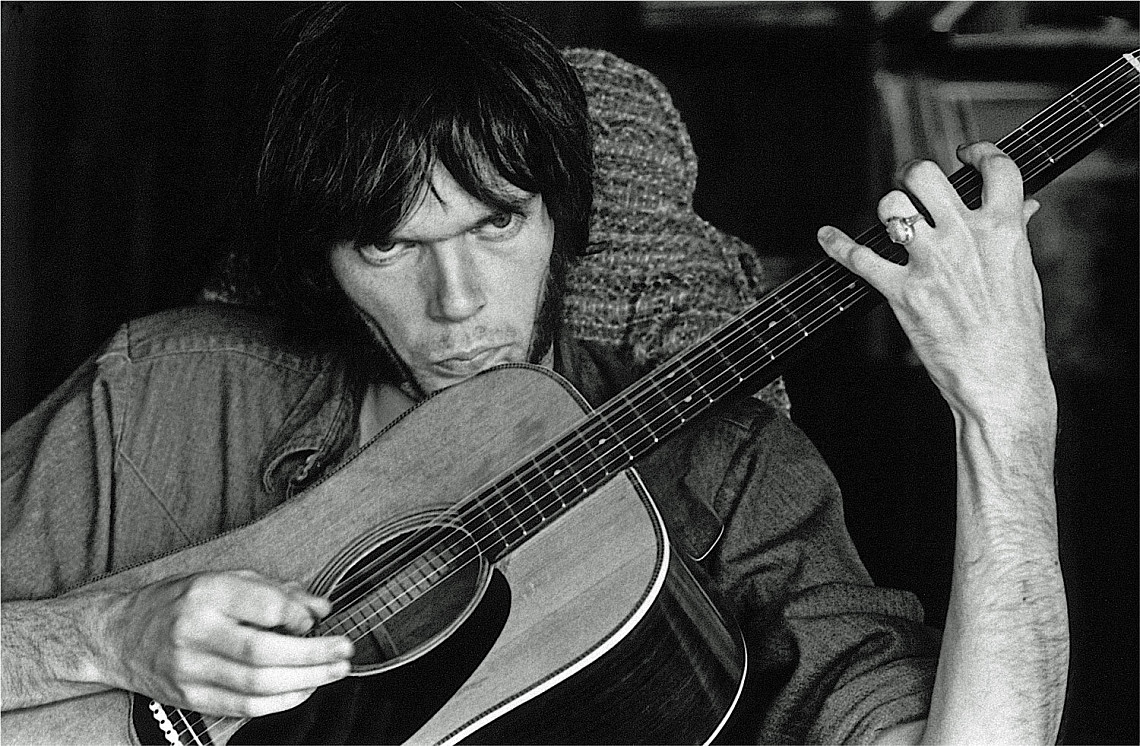 Neil Young rehearsing for the Déjà Vu sessions at Stephen Stills' house, 1969. Studio City, Los Angeles. The bass string on his guitar is vibrating.Nash: I'm a courageous photographer. I like to be invisible and I have courage. But I'm always a little apprehensive of shooting pictures of Neil. I know how private he is, I know how weird he is, I know how strange he can be. I know all that. But I wanted to take some pictures, and those pictures that you see were taken in five minutes. What I didn't know was that Neil would rehearse with us for several hours on Déjà Vu, then leave, go to the studio, and start making After The Gold Rush. Fantastic. What a musician.