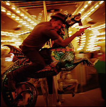 So we showed up to the County Fair, and Tom met us in the parking lot. He proceeded to pull out all these great little props that he had: a big huge magnifying glass, a couple of cool hats, this little orange fake water pistol. So we decided to bring it in, and the funny part of the story is that he wanted to tuck the gun in his waistband so that he wasn't carrying a concealed weapon - he wanted everybody to see it. And when we went up to the ticket taker, she said, "Sir, you can't come in here with that gun." He's like, "It's just a water pistol," and she was like, "Nah, I'm sorry." So we went around the corner, he stuck it in the inside pocket of his jean jacket, and he got real nervous when we snuck through the ticket taker, and couldn't find his ticket at first. He's such a humble guy and a sweetheart, yet he's this super-creative character. We ended up going in, and he kept that gun hidden the whole time, until when he jumped on the carousel. When it came around to prepare for the photo, he pulled it out and started firing it into the air.