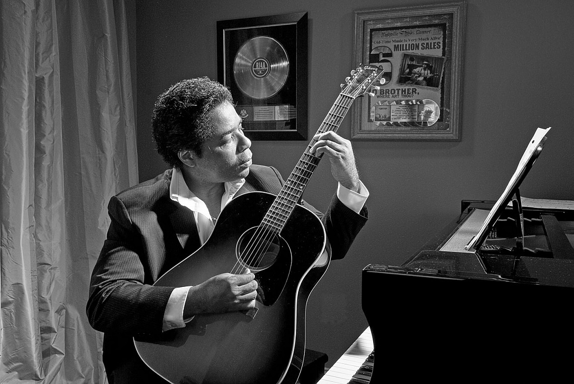 Chris Thomas King composing with guitar and piano at home. In the background are Platinum records awarded to him. Photo by Greg Miles, courtesy of Chris Thomas King Tours, LLCNo, the Grammys doesn't appreciate my work. I don't have any blues Grammys, or any notable blues awards from anywhere! I have won in mainstream categories, and I've won country and bluegrass awards. The myopic Grammys are part of the problem. Black artists of all genres are routinely marginalized. How can the most popular record in the most popular genre (rap) not simply be pop? Very bigoted and stupid.