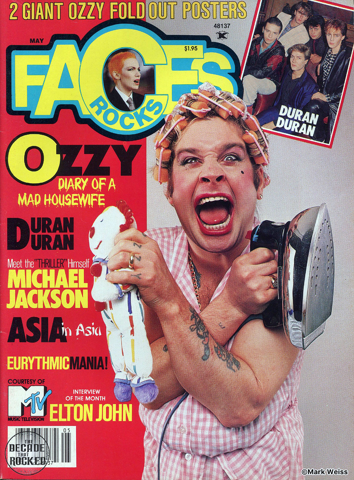 For the May 1984 cover of Faces magazine, Ozzy rocked a housewife look with curlers, make-up, and a housedress. The photo was the work of Mark Weiss, who then went on the road with Ozzy and Mötley Crüe (those guys again) for the Bark At The Moon tour. Mötley Crüe would collect panties... literally.