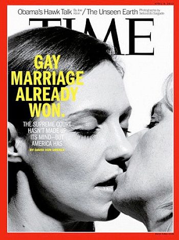 Gay marriage is being legalized in more and more states on its inexorable march toward national recognition, but Janis has no interest in another ceremony. "We got married in Canada just like anybody else got married in Canada. Why would we need to get married somewhere else," she says. "Just like somebody from New York who got married in England would keep their English marriage. That's the whole issue, isn't it? If you're married in one country, you're married in another. So what is America going to do when a Canadian employee of Levi Strauss moves to America as part of their company and then America says, Well, I'm sorry, you can't have any benefits? It just doesn't work legally."The April 8, 2013 issue of Time magazine showed two women kissing under the headline, "Gay Marriage Already Won" (an alternate cover featured two men in full smooch). The women on the cover are Kristen Ellis-Henderson and her wife, Sarah. They were married in New York in 2011.