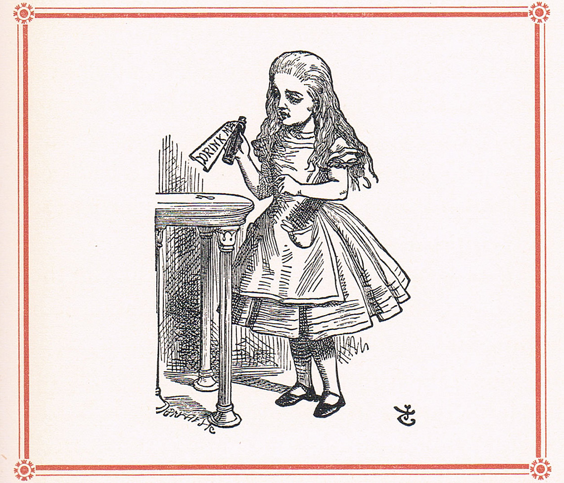 As for Alice, she spies an idyllic garden beyond one of the doors, only she's too big to fit through the tiny entrance – until she discovers a curious bottle labeled "DRINK ME."