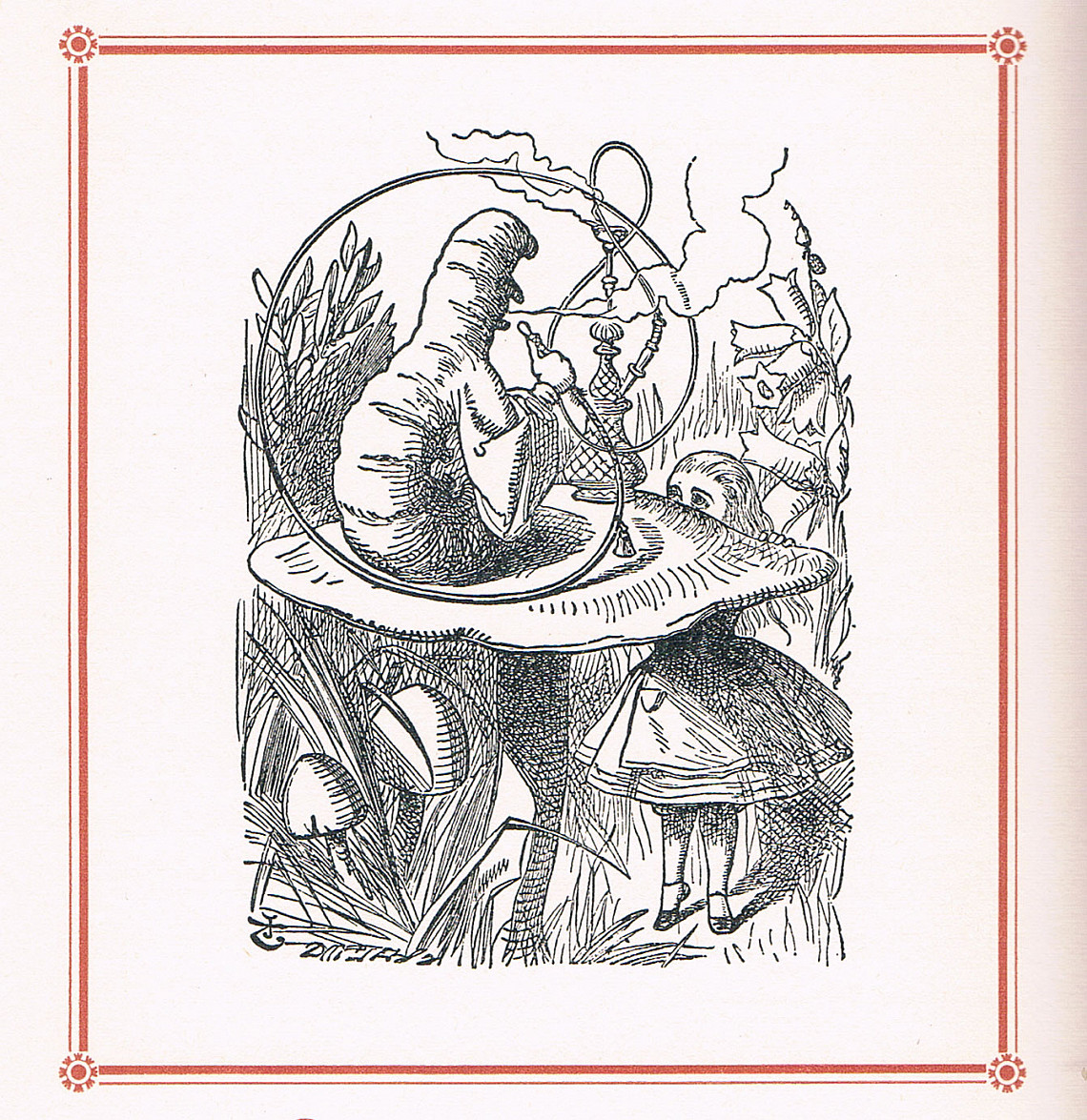 After several bouts of growing big and small, a brain-addled Alice comes across a blue, hookah-smoking caterpillar perched atop a magic mushroom. He instructs her to use pieces of the shroom to regulate her height. Her next stop is the Duchess' house nearby, where she meets another fantastical creature: the Cheshire Cat.