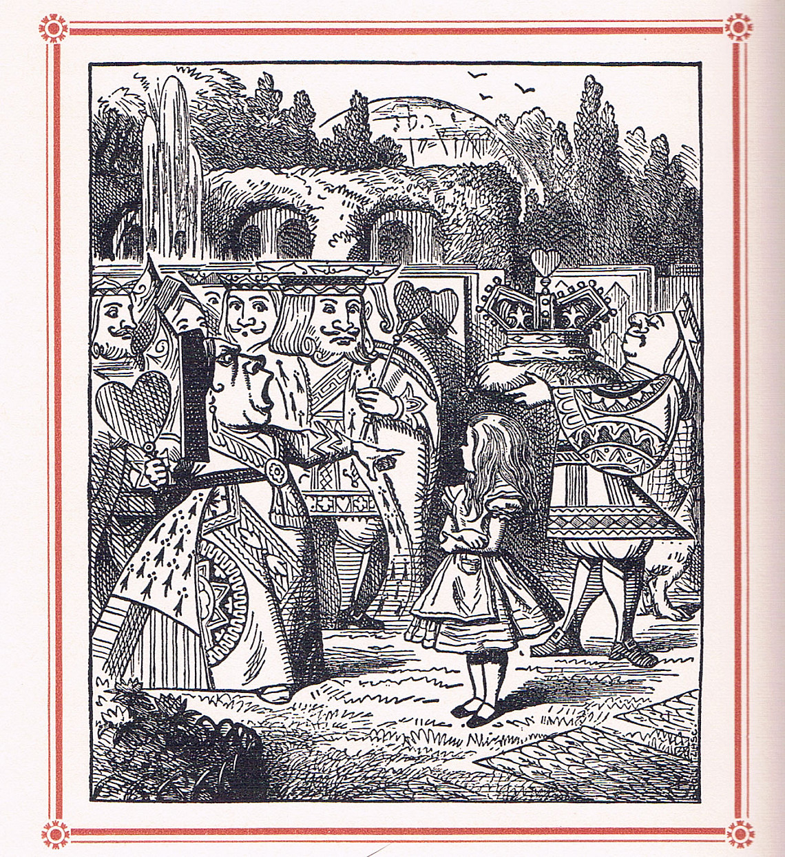 After leaving the tea party in a huff, Alice makes her way to the Queen of Hearts' croquet ground, where anthropomorphic playing cards are setting up a croquet game with flamingos and hedgehogs as implements. Alice witnesses the temperamental queen's ire when she orders beheadings at the slightest inconvenience – which is a sign of things to come. Near the end of the story, the queen falsely accuses Alice of stealing her tarts, and orders, "Off with her head!" Only when she realizes she's dealing with a pack of cards does Alice awake from her stupor, finding herself back in the real world.