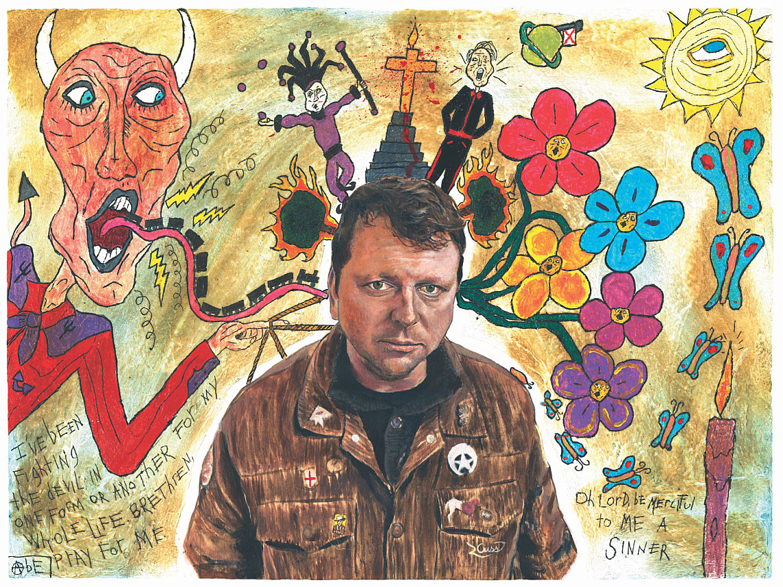 "This is a collaborative piece between me and an artist named Ronnie Criss from Nashville. He photographed me at his home several years ago and then painted this image of me from that picture. He gave it to me and I tarred it up and painted all around Ronnie's portrait. I tried imagery that best captures my plight as a songwriter and artist, and the daily choices I have to make to continue to bring light into this world."