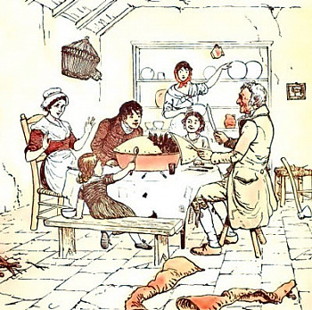 Apparently none of these naughty children who go around murdering the elderly live with the "Old Woman who Lived in a Shoe" (first published in Infant Institutes, 1797). At first glance, this rhyme seems to depict a poverty-stricken woman trying to provide food and discipline for her children.