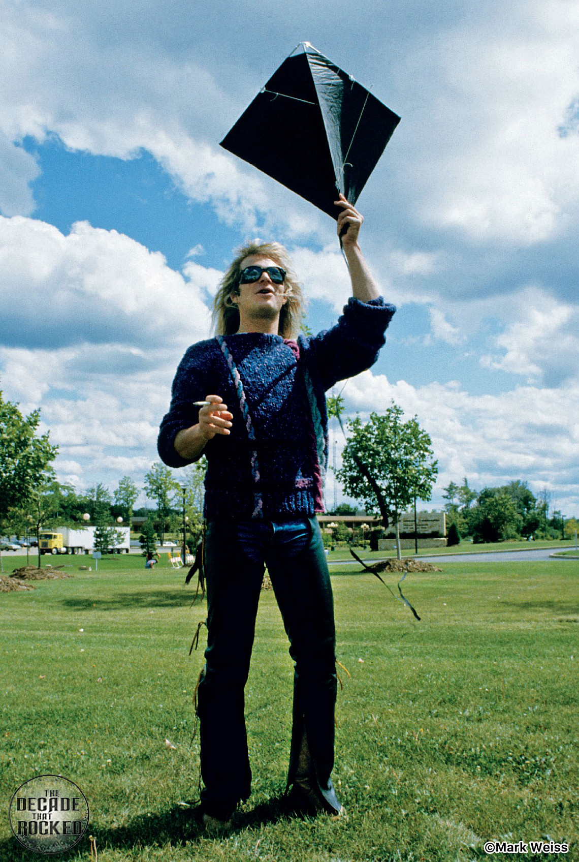 David Lee Roth with cigarette and kiteThe photo of David and the kite, they hired me on their next tour for a few days – during the Hide Your Sheep Tour. The management told me, "Whatever and whenever the guys want you to shoot, you do!" So, David called me up in the morning the day of the show and said, "Come on out, I want you to take a picture of me outside." I go outside, and he's flying a kite. So I started taking pictures of him flying a kite while he was smoking a cigarette. And then the kite got caught in the tree. I think he did it on purpose because then he was trying to climb the tree and get the kite out, always making sure I was taking photos!