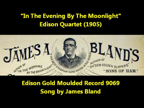 • This is a typical James Bland "coon song" and is actually sung "In de ebening, by de moonlight" etc. It was published in the 1946 collection The JAMES A. BLAND Album of OUTSTANDING SONGS... wherein it was arranged by Charles Haywood and copyrighted by the publisher Edward B. Marks. The song itself is dedicated to Neil Moore, and was originally published in 1880 by Hitchcock's Music Store.