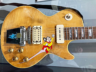 Tom Scholz donated this guitar to the Wang Theatre in Boston, where it's on display. A 1968 Les Paul Gibson gold top, it's what he used to record the band's classic albums. Note how it's tricked out with both Mighty Mouse and the artwork for their debut album.