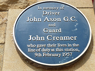 John Axon (1900-1957) was awarded the posthumous George Medal for his heroic sacrifice at Chapel-en-le-Frith, Derbyshire. A plaque honoring his death and that of the guard of the other train was mounted on the wall at the station.