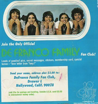 This is the sleeve from "Heartbeat - It's a Love Beat," which was the DeFranco Family's first single. This might be the first time an artist established a fan club before releasing a song. We wonder what Tony's love letter was all about. (thanks to Kent at the Forgotten Hits newsletter for the image)