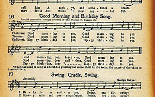 An entry from The Everyday Songbook, published in 1922, shows "Good Morning and Birthday Song," with the lyrics to "Happy Birthday" listed as the optional third verse, and instructions on how to insert the birthday child's name. There is no copyright listed on the song, which reads, "Special permission through courtesy of The Clayton F. Summy Co." (the Hill Sisters' publisher).