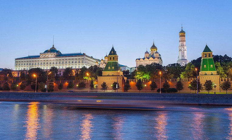 Moscow at night, with view of the Moskva River and the Kremlin